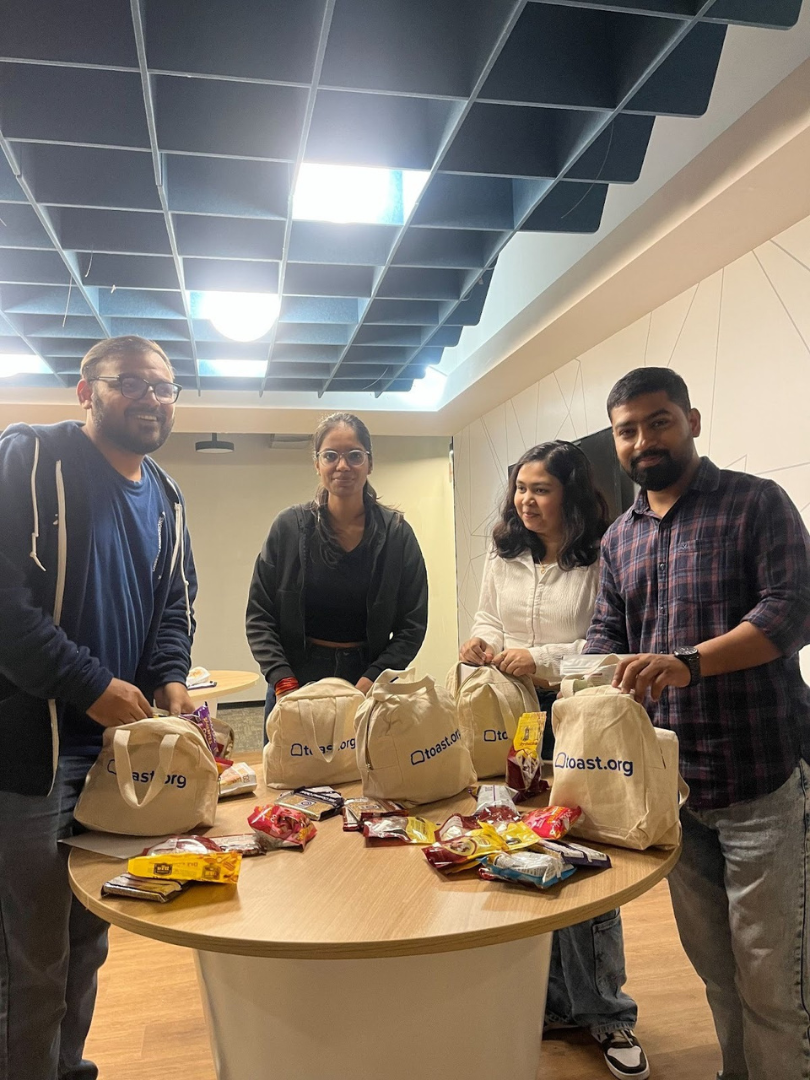 Additionally, 50 Toasters came together to pack 400 nutrition kits for local government school children. This heart-warming initiative, powered by Toast’s Season of Giving grants, brought the team together in a spirit of camaraderie and excitement. Each child received a reusable bag filled with healthy essentials like seeds, nuts, nutritious jaggery snacks, and millet malt, along with a new water bottle. It was a meaningful way to mark the start of our journey in this new office by giving back to our local community.