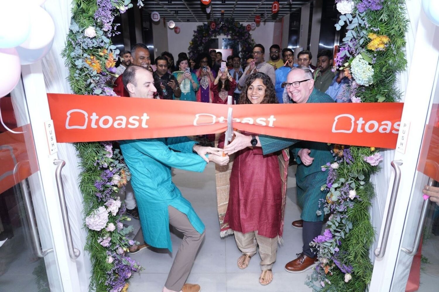 The opening festivities ran throughout the day, including a ribbon cutting ceremony with leaders from around the world. Toasters were encouraged to take pictures in our photobooth and to show off their new Toast gear. We also hosted a team wide meeting, where employees were able to hear from Co-Founder Steve F., SVP India Site Lead Kavita V., and Murali V., Area Vice President of People, APAC.